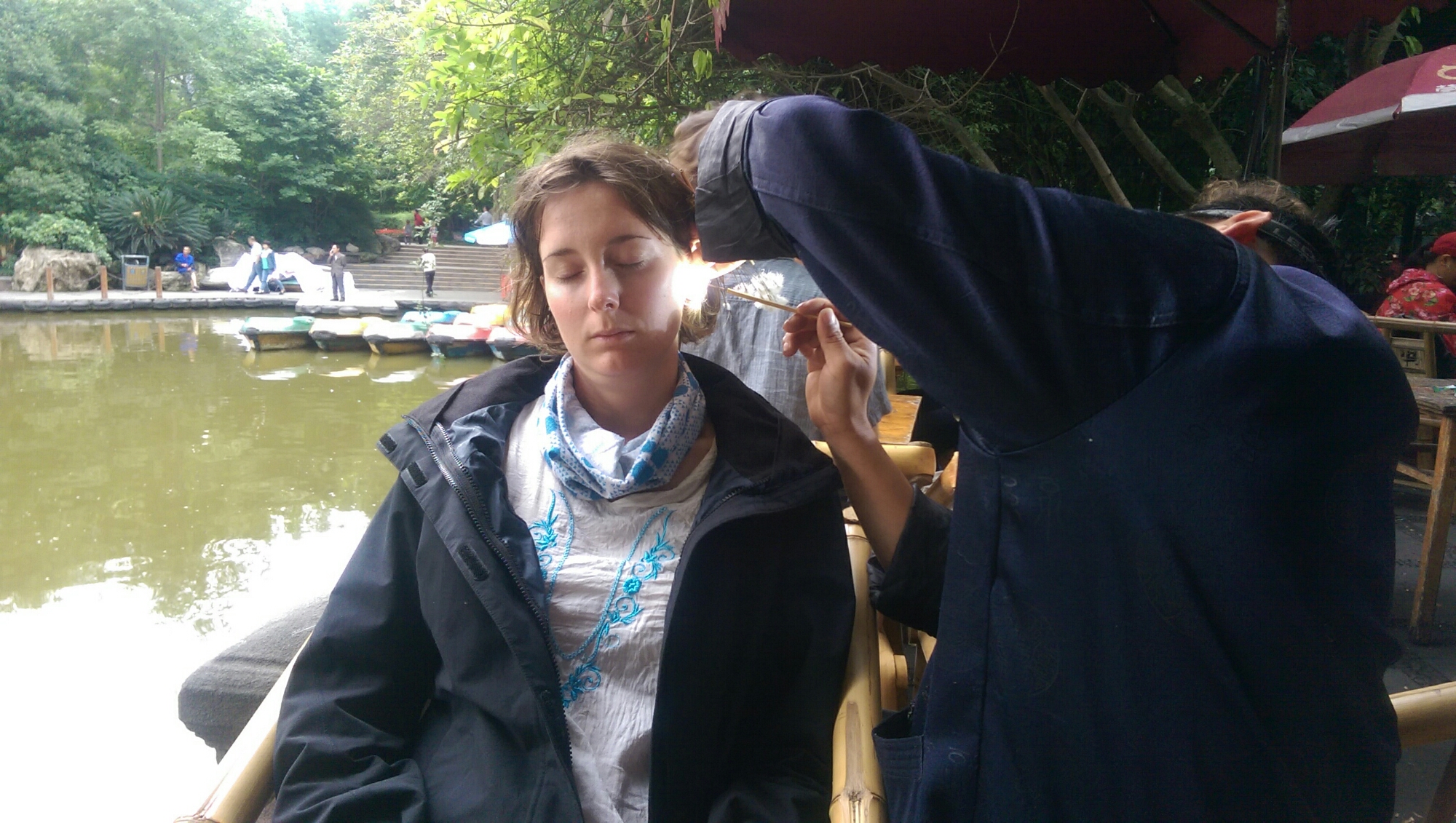 We spent a nice hour sitting by the rowing pond in a traditional tea house where I partook in the ultimate Chinese relaxation treatment – having your ears cleaned.