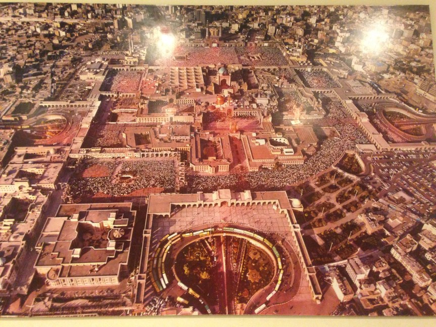 Before heading over to the site’s museum, Paddy was lucky enough to be taken down into the main prayer room – a huge cavernous underground space who’s walls and ceiling are covered with mirror shards. Huge chandeliers hang from the ceiling. Unfortunately I wasn’t allowed in but Ali told us that the purpose of the broken mirrors was to help pilgrims to forget their individual needs and wants and focus on their message to Allah.