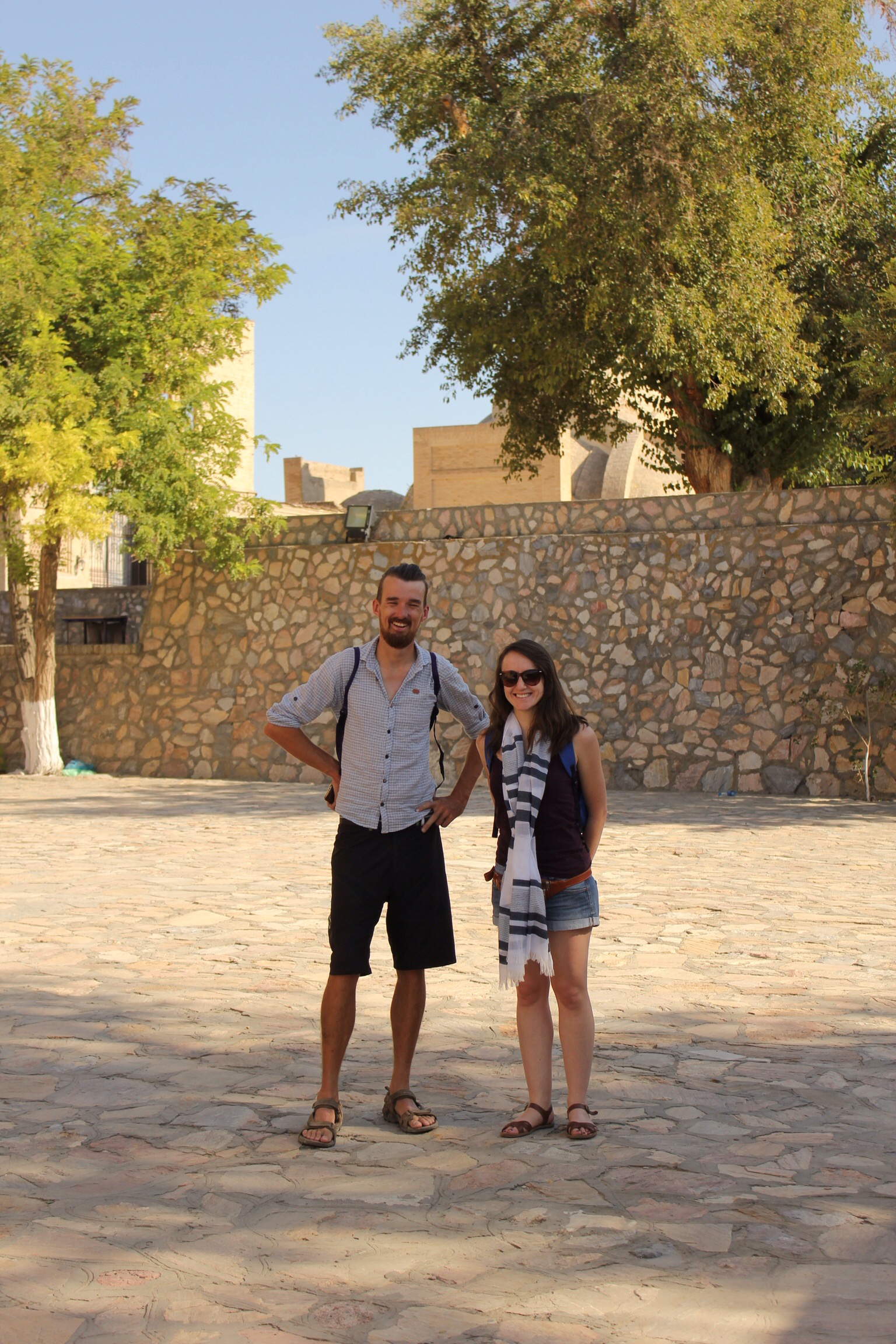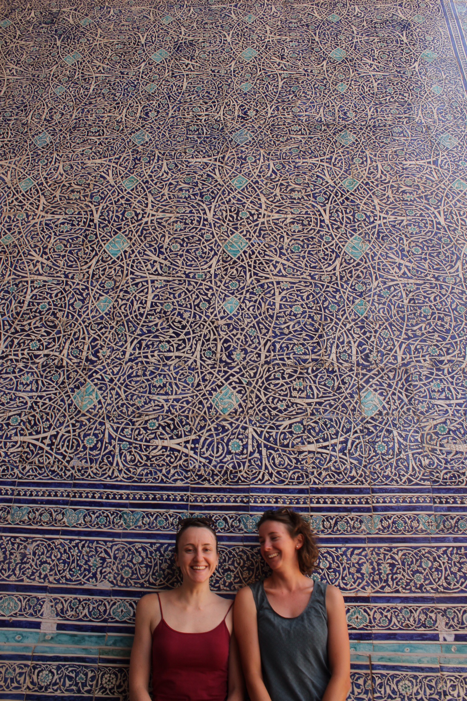 Both sexes are required to dress conservatively and women must wear a chador on site. Luckily I was able to borrow a thin 100% cotton one from Zena. Here we are in the large square.