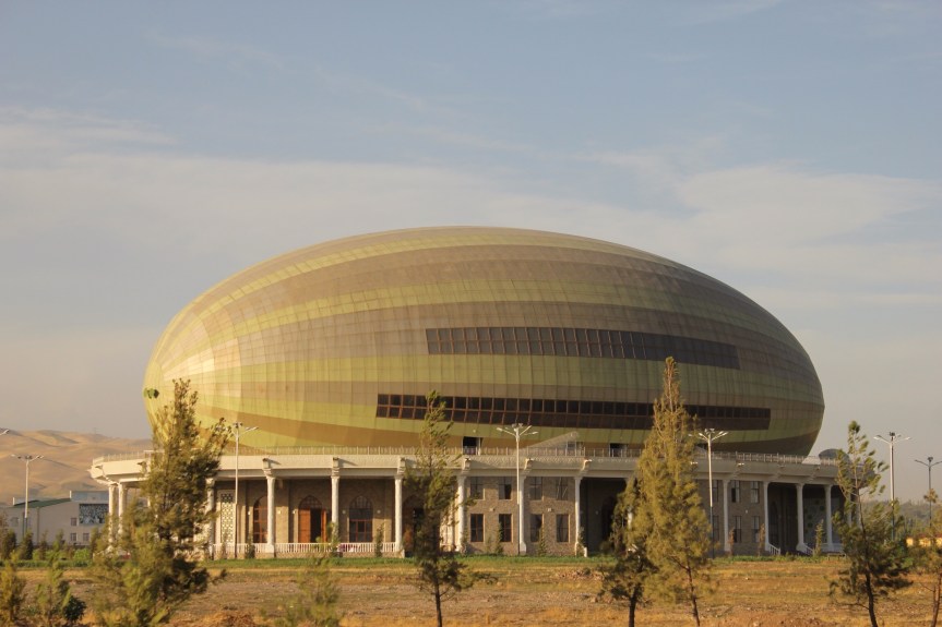 Remember the Tajikistan president holding those big melons in an earlier post? – well here is a big building shaped like a melon which we passed leaving the country…