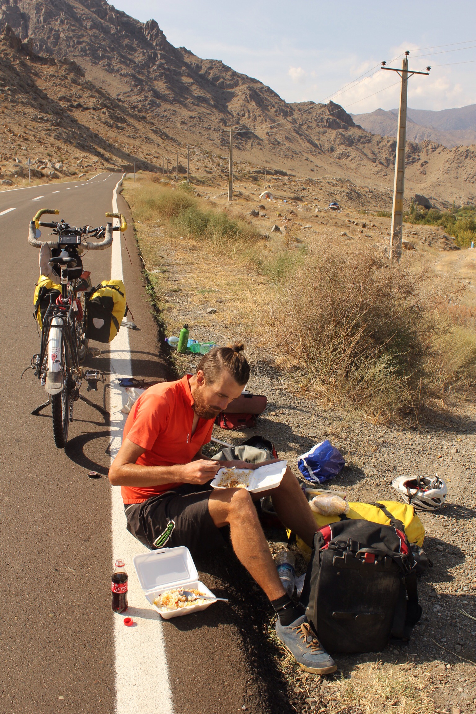 Irananian kindness saves the day when a guy (who had obviously already driven passed us once) takes time out of his day to bring us mutton stew and rice. We eat hungrily before loading the bike up for the third time that day.