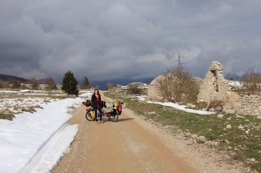 After this final village the Tarmac ends and turns into a dirt track winding its way up the valley next to a river. No snow on the ground yet but we still had 500m to climb… We pass an old army checkpoint and we assume that we are now about to cross into official Republika Srpska territory. No one is manning the post and none of the villagers stop us as we cycle through – we do wonder if we will encounter a difficult road ahead though…