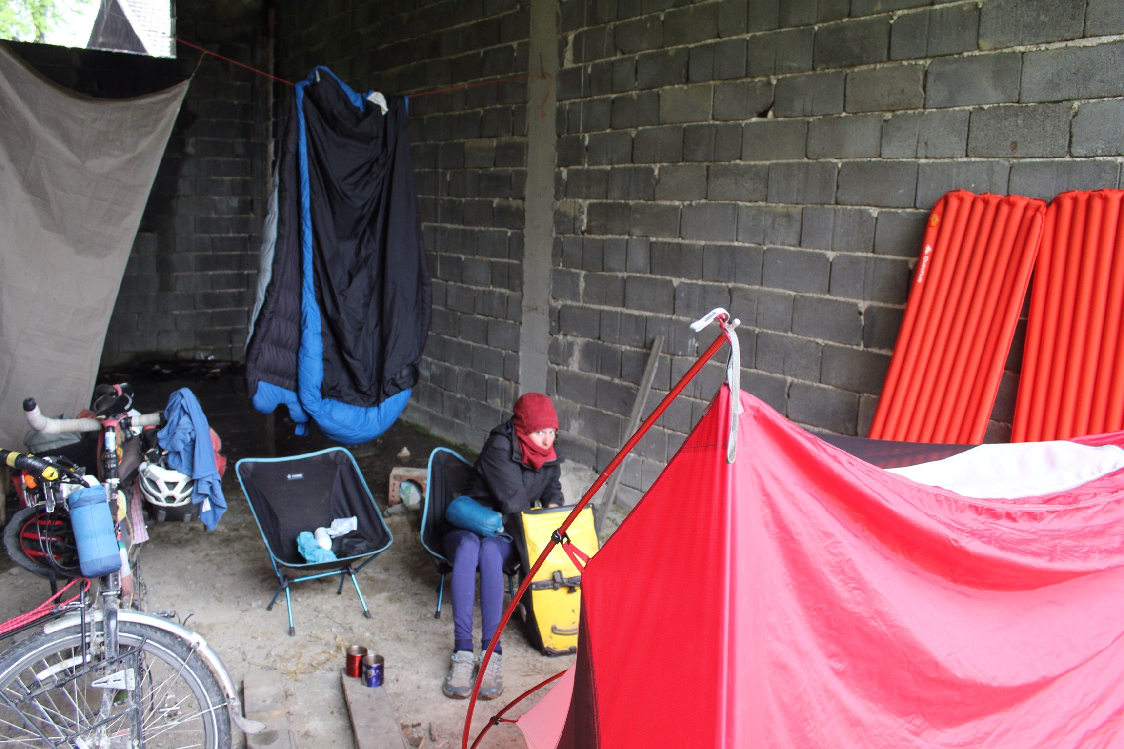 We waited… and waited… all night for the rain to hit but it didn’t start until 4:30am when it dutifully came teeming down. Unfortunately for us the building wasn’t as waterproof as we though and we woke the next morning to the tent sitting in a pool, water seeping into the tent and all our gear waterlogged… Frustrated and grumpy we climb out and try and dry everything off as well best we can. The rain continues all morning and at 11am turns to thick snow which eventually starts to stick.