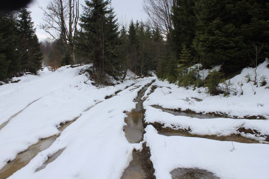In short we do. The road gets gradually worse and worse and patches of melting snow start to appear. We’re able to cycle through most of these and we are cheered by some fresh boot-prints on the track too. Then we encounter our first major hurdles: first a dug out trench which covers the whole road apart from a thin slice at the side where we precariously push the bike across, the back wheel sliding slowly into the ditch as we go. Then, around the corner, a man made mound which we have to lift tandem over. Overcoming these obstacles the track starts to snake upwards and disappear under icy water… Melting snow. Up we scramble – at times pushing the bike through inches of fast flowing water. Paddy’s shoes do not hold up well to this treatment!