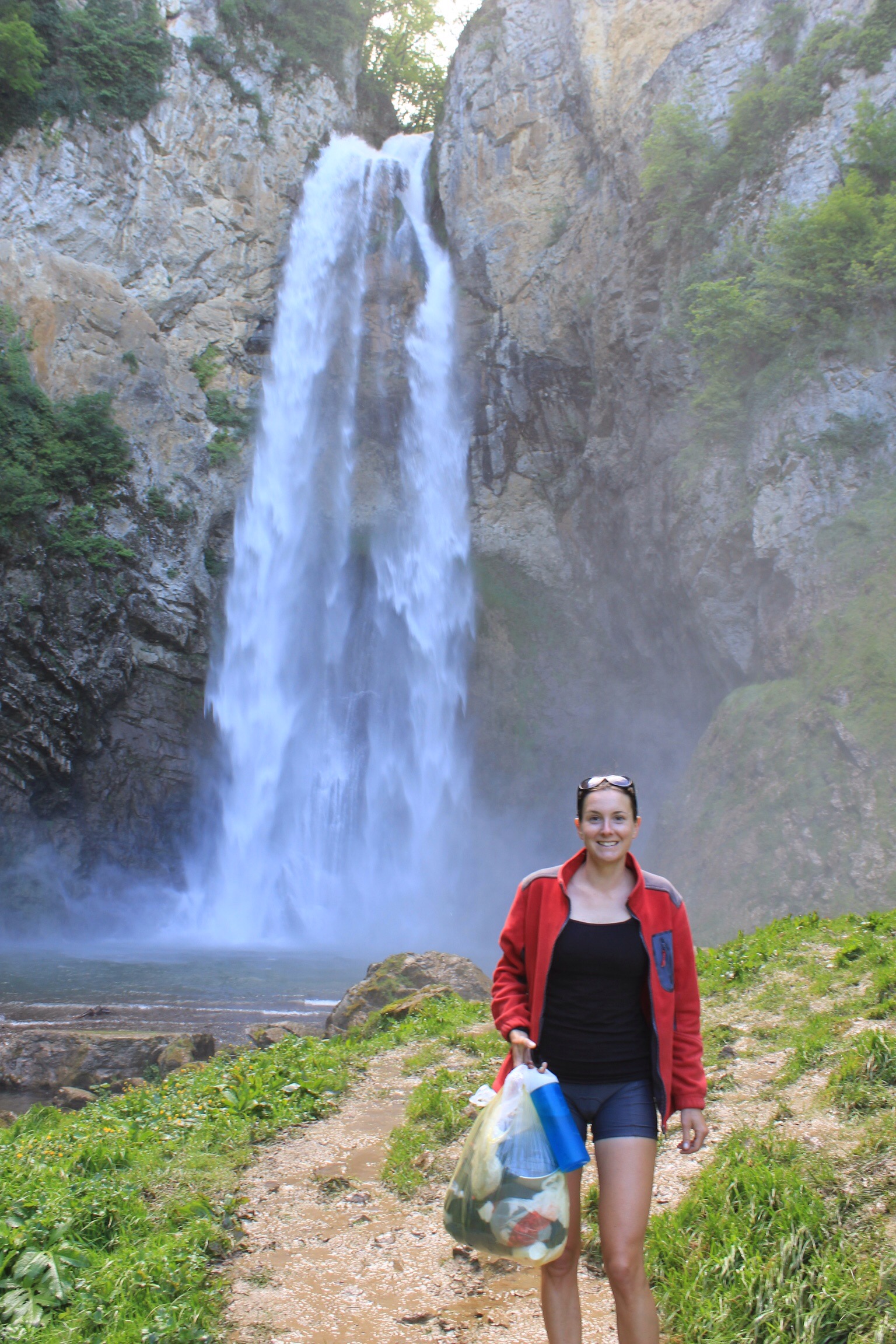 We decide we can’t set the tent up here though, however tempting, so we head out of town and swing west through some lovely rolling green countryside which reminds us both of the U.K. We pass a sign for a waterfall and decide we have time to investigate especially as it might provide a good opportunity to wash ourselves and our clothes. It’s a good waterfall and although the water is freezing we both brave a bath and feel very refreshed after.