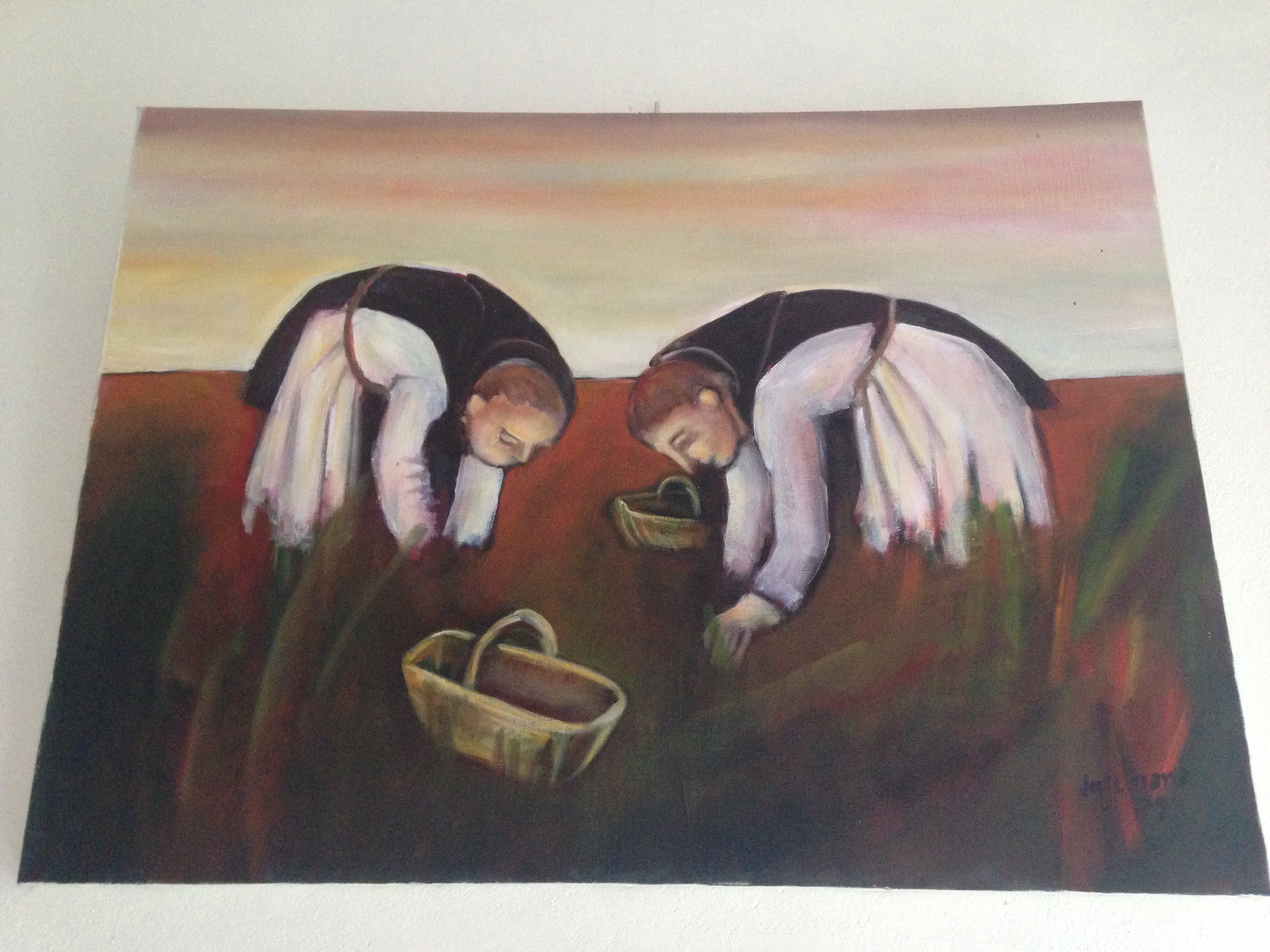 Thankfully the golden fields soon turned into forests of oak trees as we reached the Normandy border at La Luppe and cycled through the north section of Parc naturel regional du Perche. The thunderstorms made a come back that afternoon and we stop at Abbaye de la Trappe to fill our water bottles at the healing spring there dedicated to St Bernard. We have to wait in line – clearly it’s the done thing for local worshippers to fill large 5l containers with the water to take home with them! While we refill we get chatting to a nice Frenchman from Paris who invites us into the Abbey’s art gallery where his Japanese wife has an exhibition of her paintings.