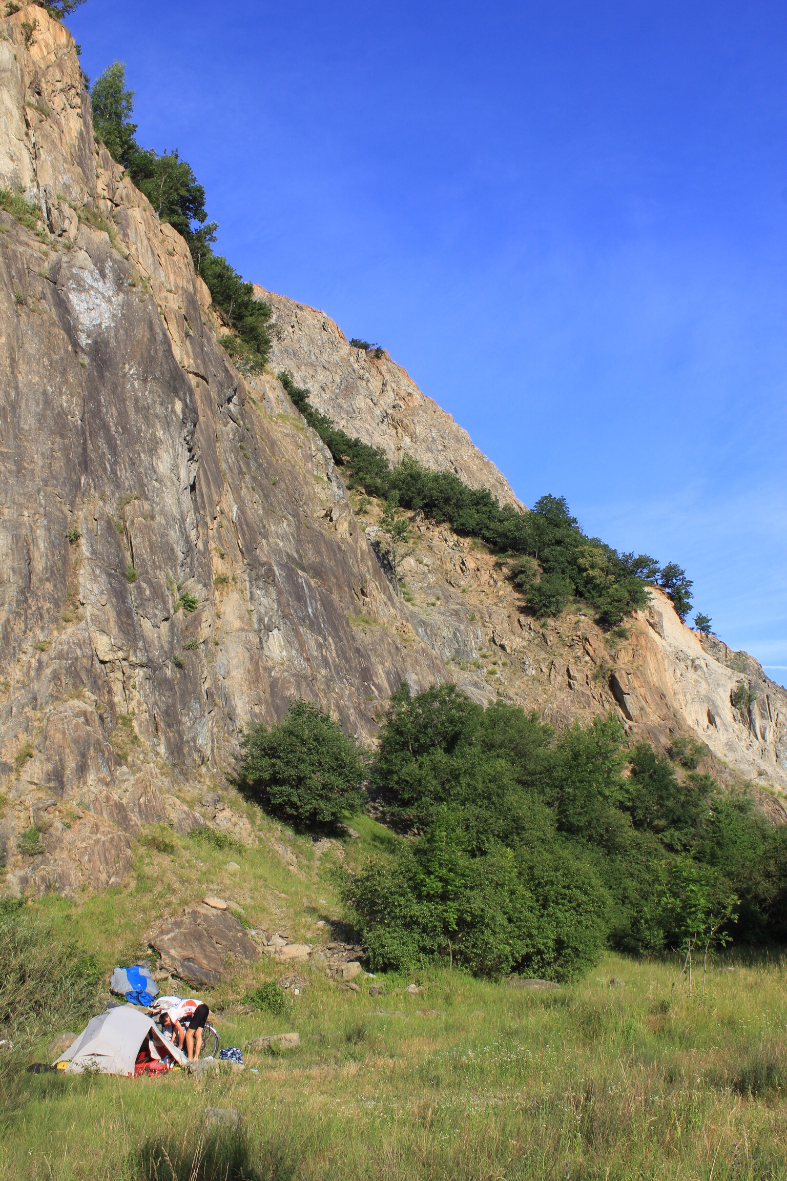 The next afternoon we reached Orleans giving ourselves enough time to visit a dentist because Paddy’s filling, which he had done in China (along with the root canal), fell out. We’ve had good weather in France but the next day was spent dodging the thunderstorms as we skirted round the bottom of Paris towards Normandy. We managed to find shelter for the majority of the downpours and just got the tent up under the shade of a great oak tree before the evening rain started -we were forced to cook our pesto and ravioli in the vestibule followed by delicious French eclaires in the tent.