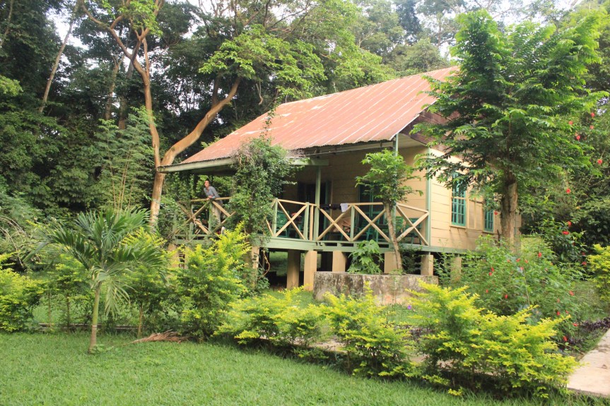 From here we needed to pick up a local tro tro heading west so we could reach our planned destination – Bobiri butterfly sanctuary – that evening. A nice Policeman helped us call down a van and with no hassle the bike (verticals style!) and the bags are tied onto the back and off we go. The tro tro takes us a good 80km down the N6 towards Kumasi where we get dropped off in Kubese. The sanctuary is well signposted and although a bit slippery in places with mud we reach the heart of the reserve in 30 minutes. True to it’s name we see a lot of butterflies even though it’s not really the season for them. The guesthouse sits in a clearing surrounded by beautiful blooming shrubs, roses and flowers. Beyond, the thick forest branches out in every direction. It’s idyllic and for £8 a night and the only guests there we feel we have really lucked out. Founded in 1942 by the British, the butterfly sanctuary has been managing this local area of forest ever since. Remnants of the old British style architecture can be found in the wooden library house and adjoining terrace (sun downers anyone?!). Here we cook and eat dinner browsing the ecology books from the shelves. We sleep very well and enjoy following ‘The Three Sisters’ trail the next day through the forest before jumping back on the bike and cycling back along the track.