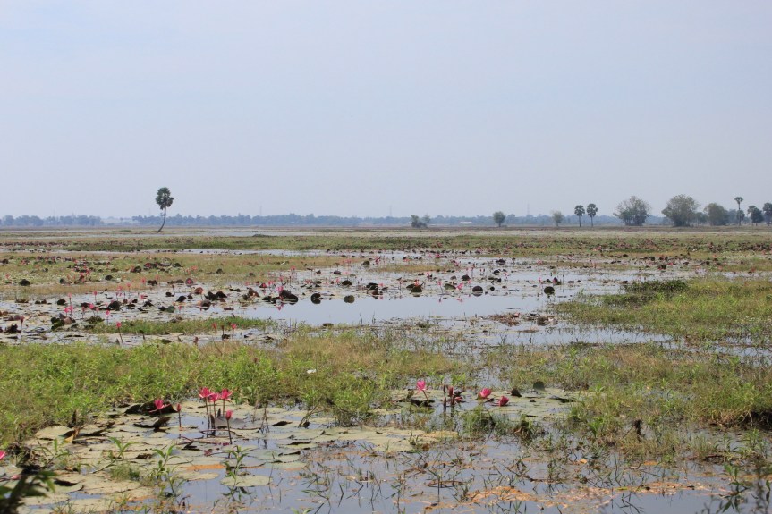 Taking all this into consideration we stocked up at the big market in Takeo, let some air out the tyres and headed directly north out of town along the windy roads through the lakes and canal network which run parallel with the N2. It was a great ride – a flat, quiet dirt track lined with spectacular lily covered lakes, friendly villages and plenty of shelter from the headwind. We stopped at this amazing setting for lunch along the way which gave us the opportunity to try out our Life Straw filter.