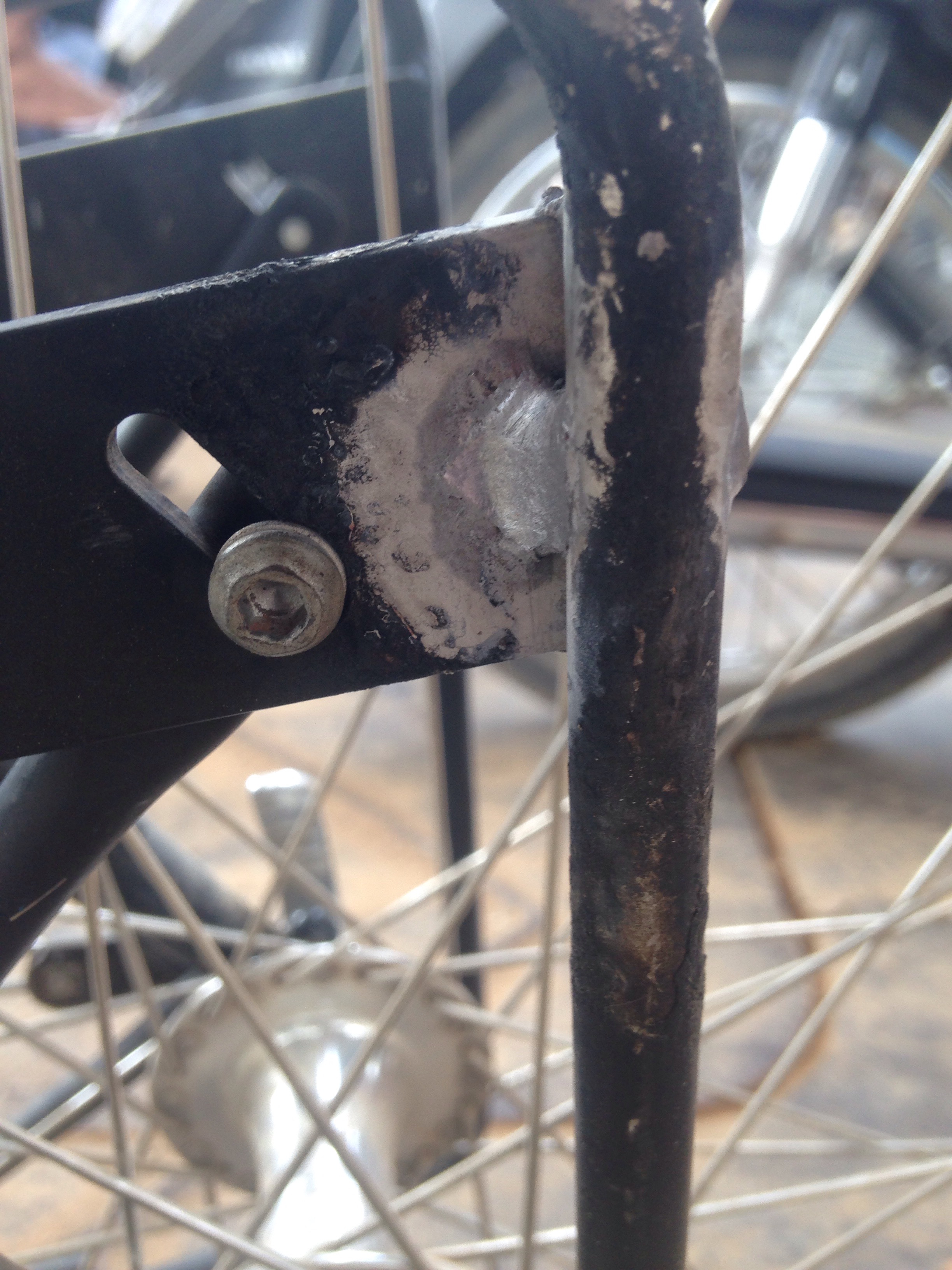 During the ride into Phnom Penh we ran over a particularly large bump and the cross bar of the right side of our front rack broke cleanly off.