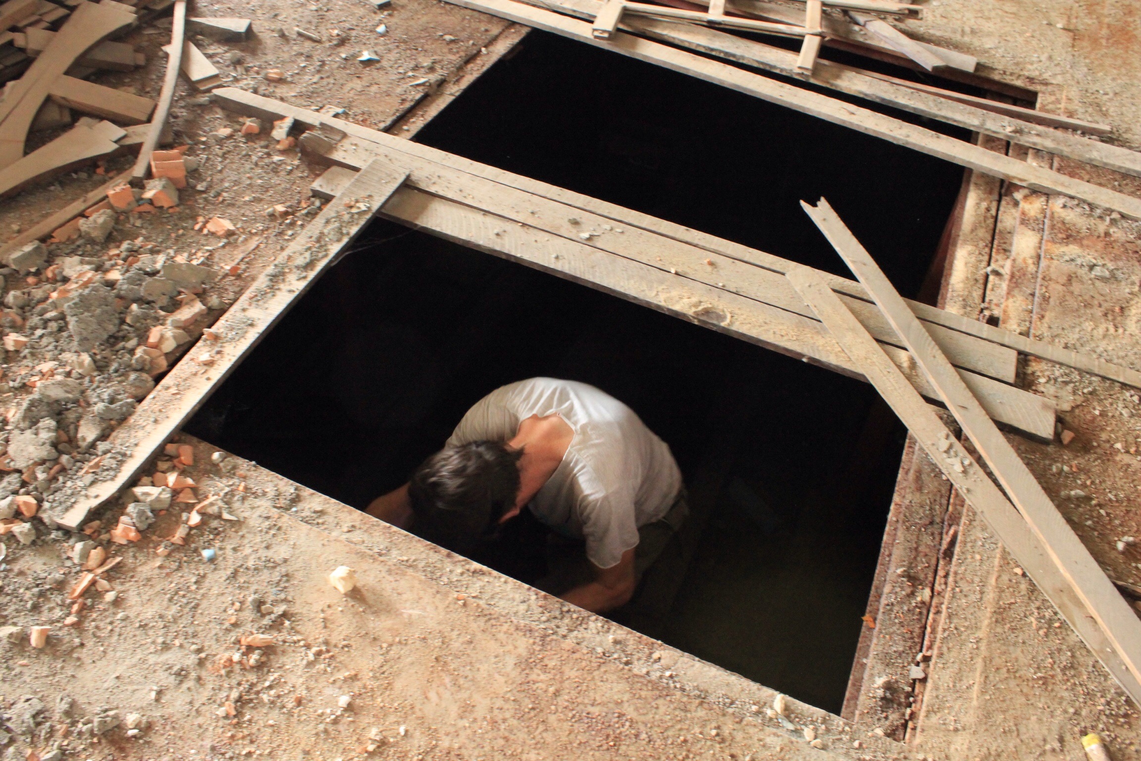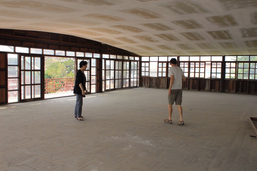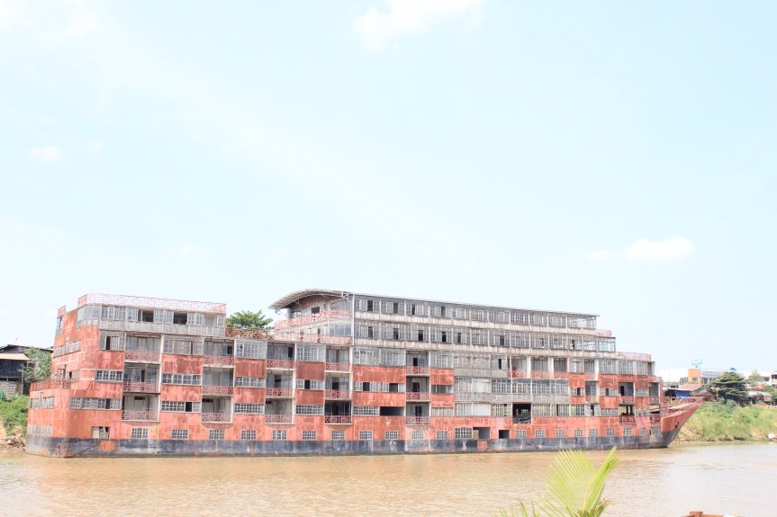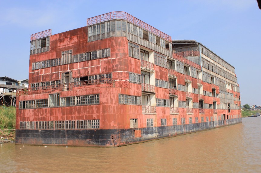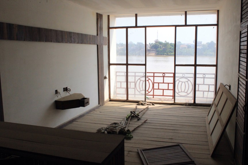 At first you might ask why Paddy and I are visiting a collection of rubble filled rooms connected by dark corridors and step ladders instead of strolling around Phnom Penh’s Russian Market or relaxing in the shade of The Royal Palace. But this isn’t any old building on the outskirts of Phnom Penh, it is in fact the chosen space for Cambodia’s first major arts centre. And its no building, it’s an abandonned boat.