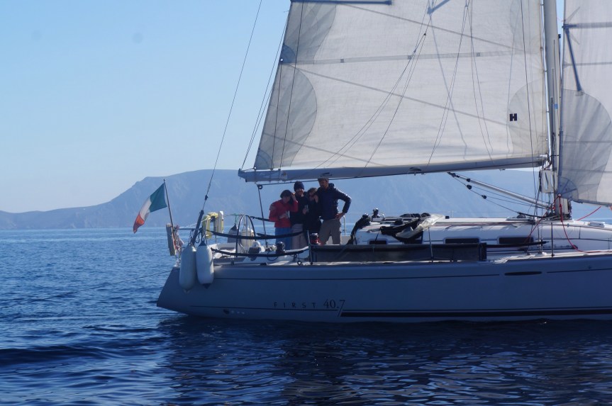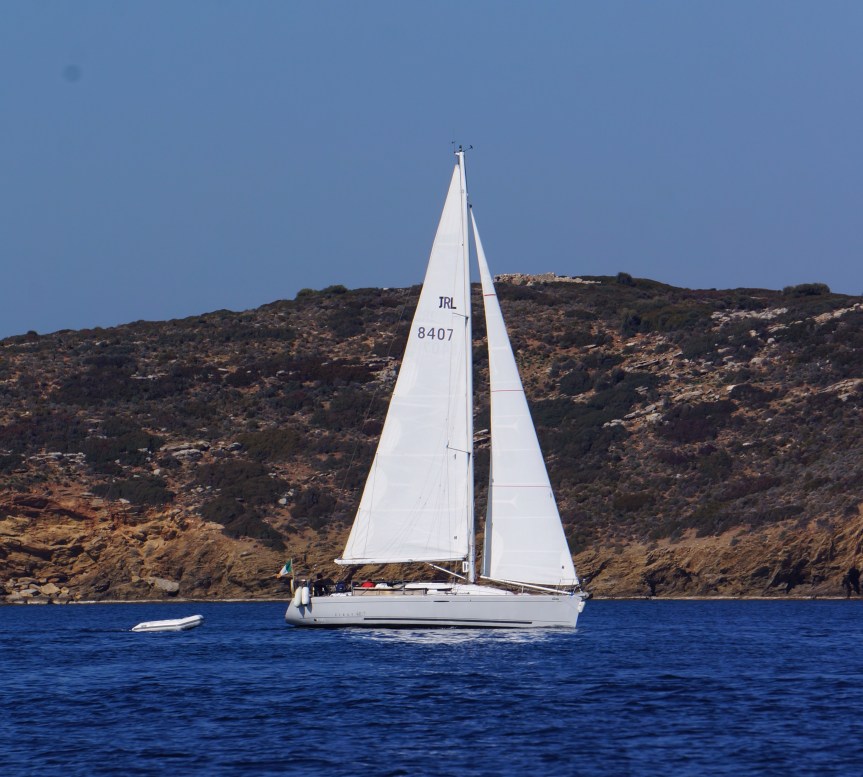 Some time after, the three guys sailed past us on Stella. We had all agreed to meet in a sheltered bay on Idhra island which sits just south around the headland and so around an hour later we set off to try and catch them up.