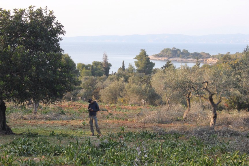 The next morning we all climbed in the tender and rowed the 2km across the bay to the other side of Dokos where we had heard there was a Mycenaean archaeological site. We never found this, but we did spend a great 20 minutes with a very friendly Greek lady and her mother who lived on the hill overlooking the bay. She offered us Retsina and showed us around her house and extensive garden and olive grove before seeing us on our way. We meandered down around the headland through the knotted olive trees and finally came back to the coast where we found a huge tortoise and lots of washed up sea anemones. We were all pretty hungry by this point and were complaining about the fact that we had to get back to the boat before eating when George mischievously produced a block of feta, a bag of olives, a loaf of bread and beers from his bag. We sat eating and sunbathing on the beach before rowing back.