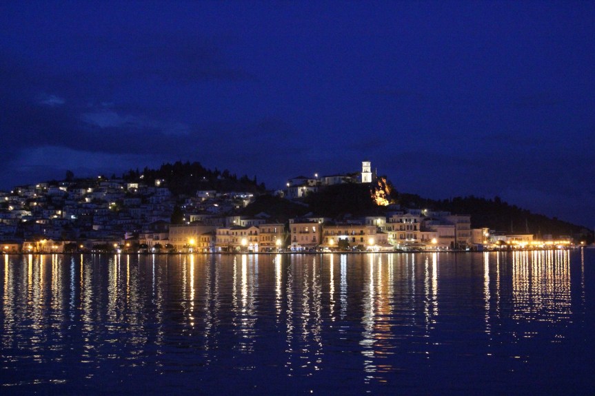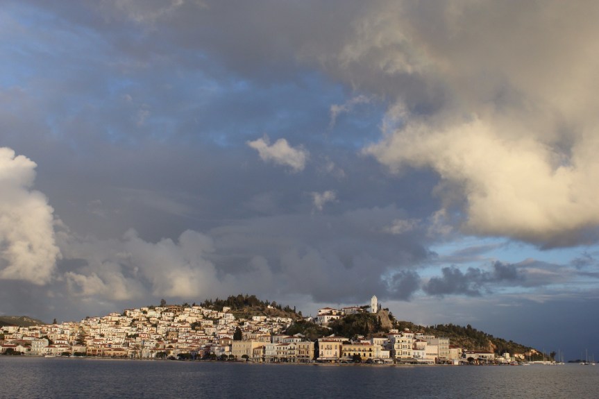Once back on the boat we had a quick lunch before pulling up the anchor and motoring south to the island of Poros. There wasn’t a breath of wind and the water was like a glassy lake so we stuck the autopilot on and enjoyed lying in the sun reading, drinking tea and eating digestive biscuits. Poros sits very close to the coast of the Peloponnisos and it’s a spectacular sail into the narrow channel which provides plenty of shelter for boats to moor.