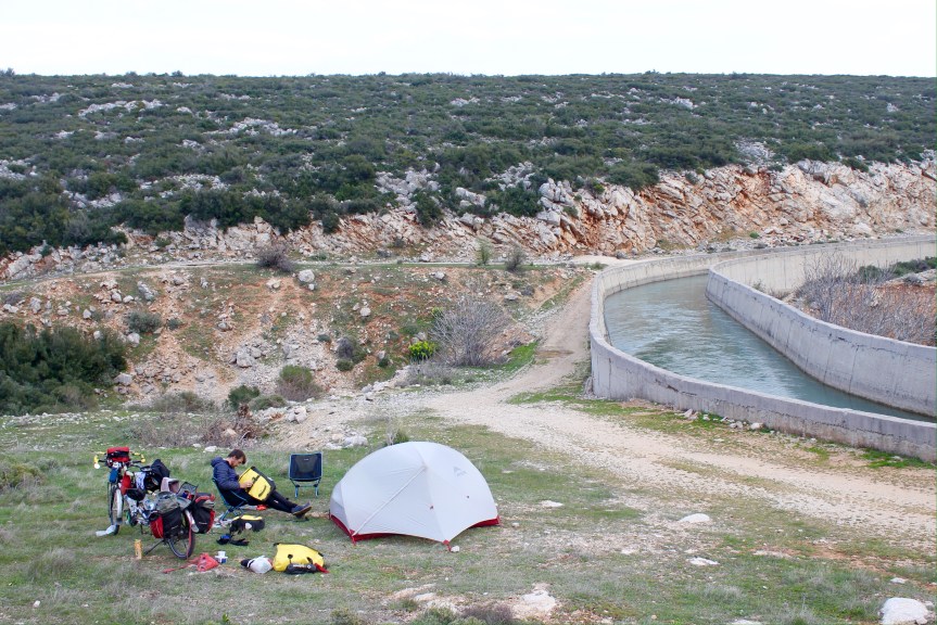 A 6.30am start sees us complete another big climb where we then shoot down the other side to Plataea and the wide, open, fertile valley beyond which was where the Greeks had the final victorious battle with the Persians. We see a nasty weather front heading in from the north but manage to shelter under a picnic area as it rolls past us. The rest of the day ends up being quite warm and before the next climb which was due to take us all afternoon Paddy spots a large canal carving its way through the valley. After a quick look on the map we confirm that the canal is going in the same direction and we can link back up to the road in 20km – a much easier option that struggling with those hills. We stay on the dirt road next to the canal for the remainder of the day and camp 1km from where it meets back onto the road.
