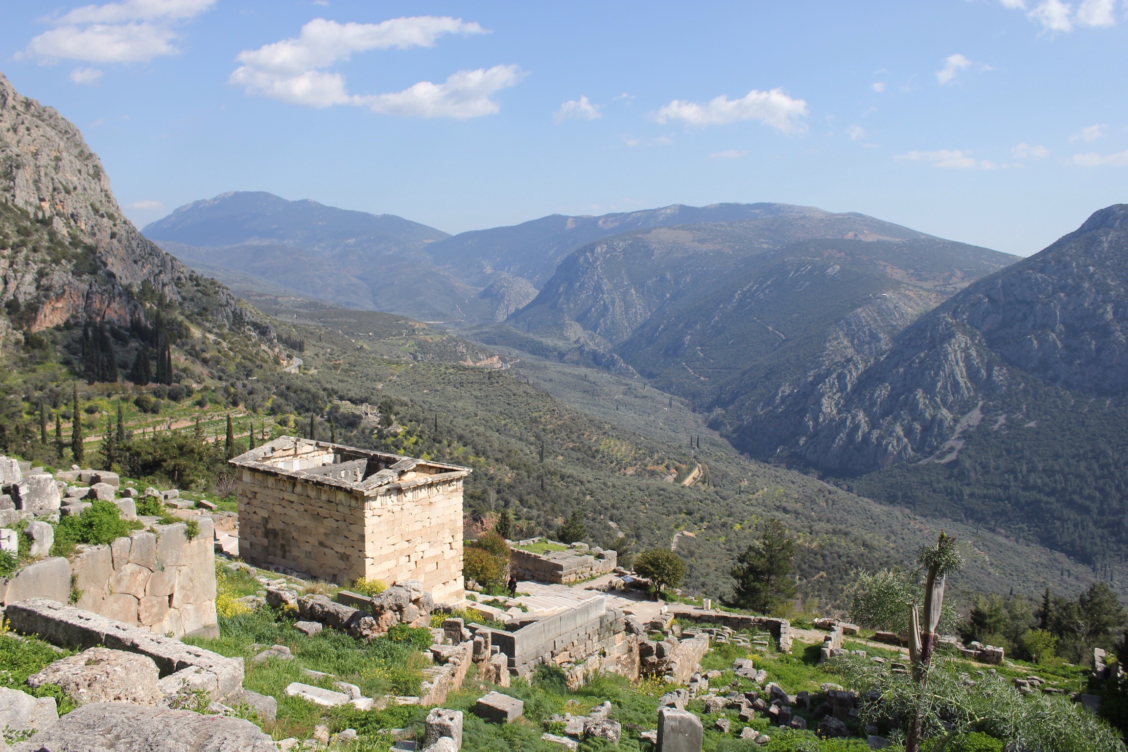 Temple foundations Treasury of the AtheniansMany of the statues and buildings which, are in themselves the finest examples of Classical Greek art, were inscribed. So the site gives historians an incredibly complete and diverse picture of Panhellenic history and cultural practices. For example on the wall of the Treasury of the Athenians is inscribed the Delphic Hymns – some of the earliest known notated musical score.