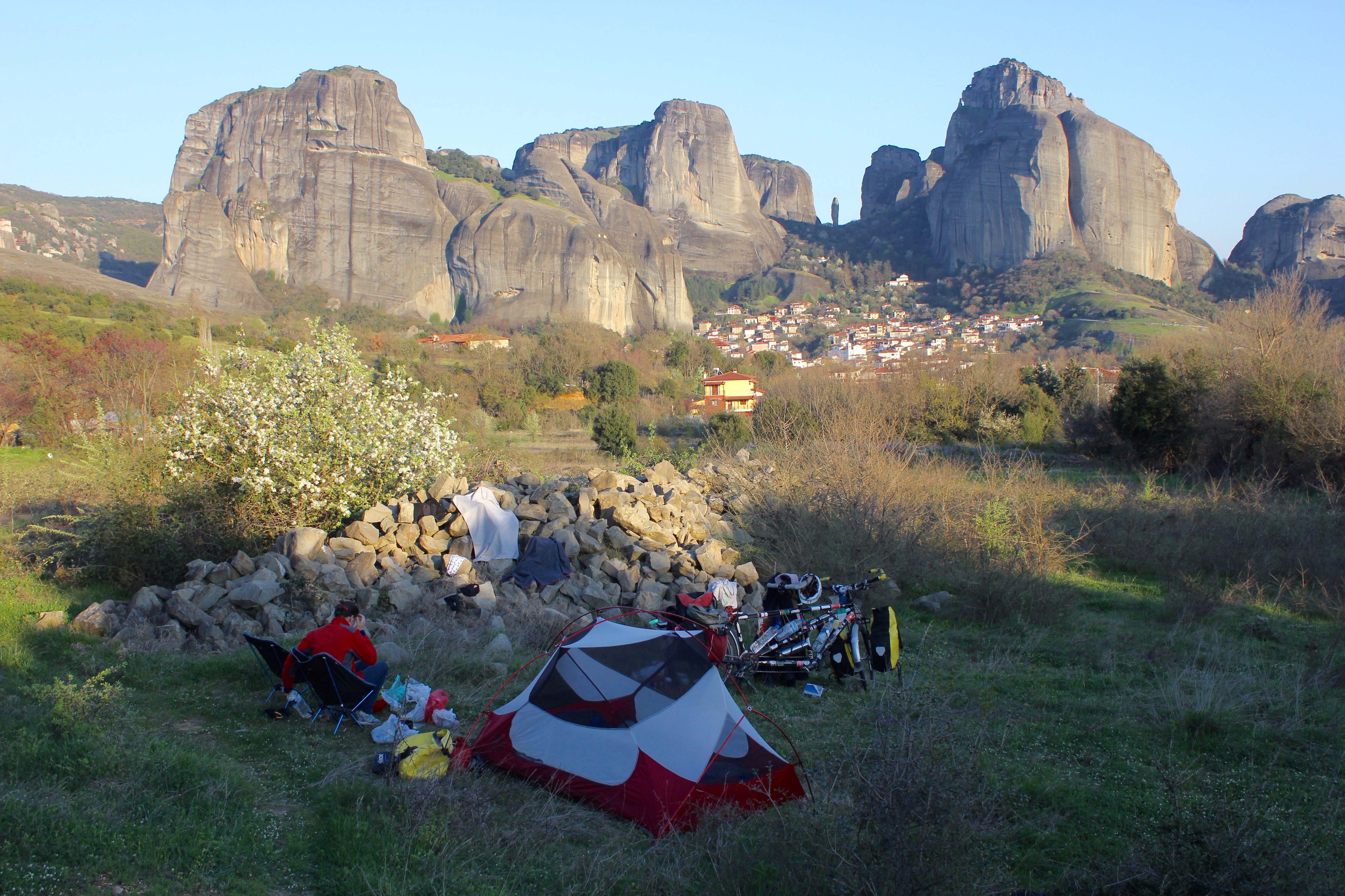 We stop for lunch and half way up the mountain across from us is Hosios Loukas – a large monastery. It is famed for its Byzantine architecture and it’s the only known church built on mainland Greece during the 10th century. More climbing that afternoon and very tired we pull tandem off the road and down onto a sheltered, hidden patch of grass. We were due a cold night that night and we were at 700m so we forage for wood and prepared a fire before setting up camp and eating dinner.