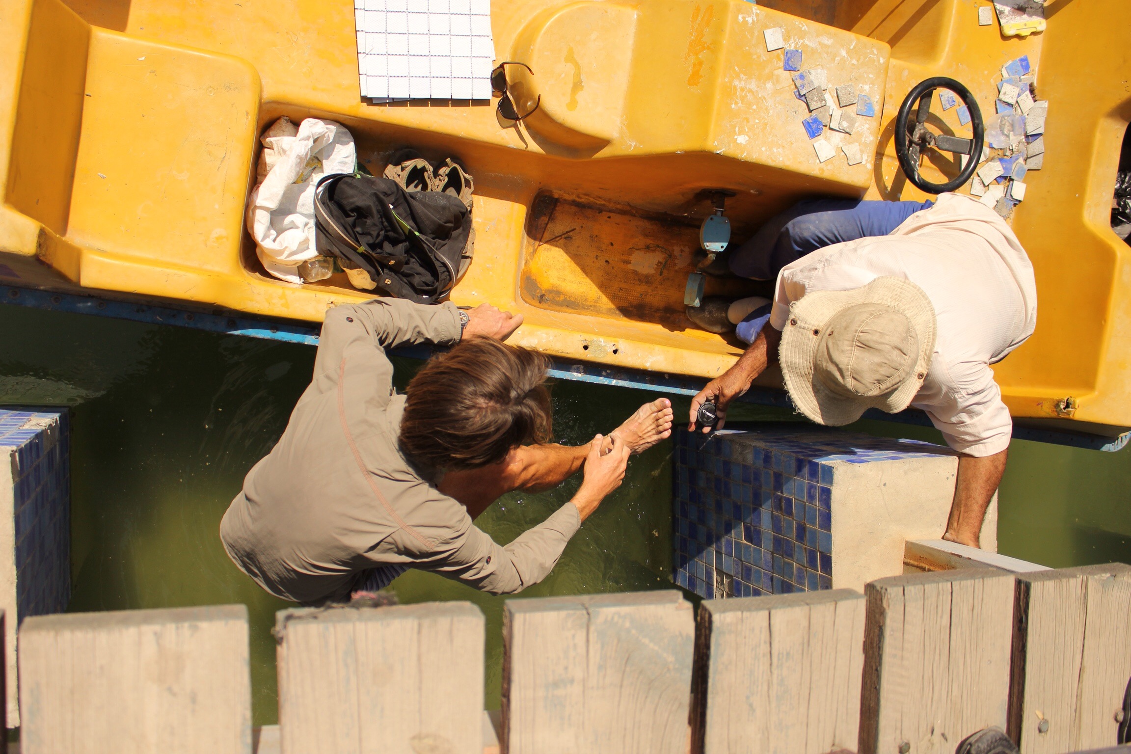 While walking over the lake I dropped the lens cap into the water so we had to enlist the help of the nice pedalo owner to get it back…