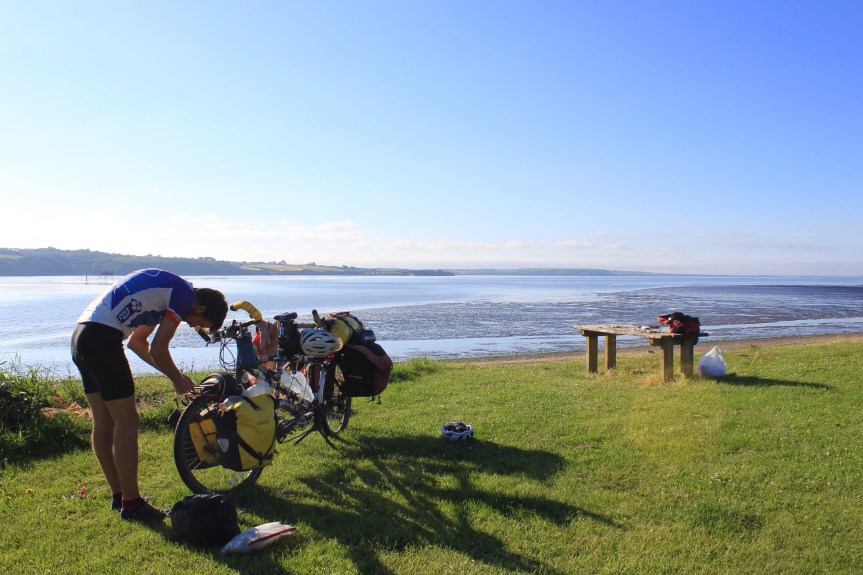 So off we went from Roslare and headed south to Waterford and the mouth of the river barrow where we crossed on a short car ferry to Passage East. We decided that the village provided a good spot to set up camp. We absentmindedly ignored the ‘no overnight camping’ sign because Paddy insisted no one would care and that the Irish all have a tendency to not do as they’re told anyway. I had been invited for a Skype interview scheduled for a few days time so Paddy offered to set up camp and cook dinner while I spread out over the picnic table and started researching and note taking.