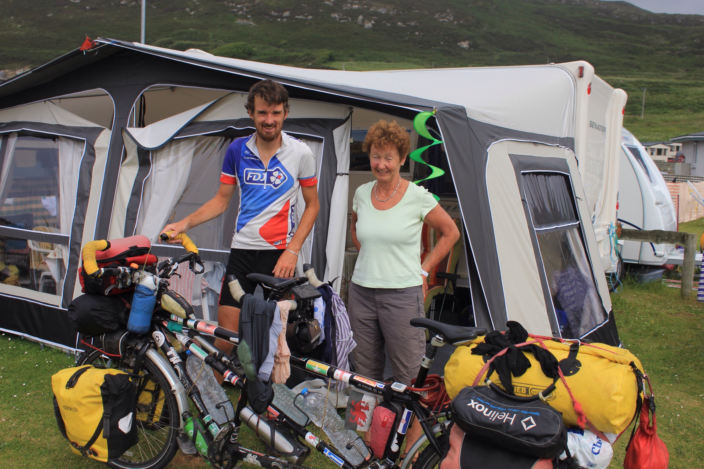 Helen who had seen our parked bike on the beach earlier had cycled all the way up the hill from her camping ground below to offer us a bed in her caravan for the night. Overcome by this kindness we gladly accept and hurriedly pack up before following her back down the hill. We spend a very comfortable night in Helen’s caravan and even get treated to fried eggs, bacon, and black pudding in the morning. Word soon gets round that we are travelling by bike and we enjoy meeting many of Helen’s camping neighbours over a leisurely morning.