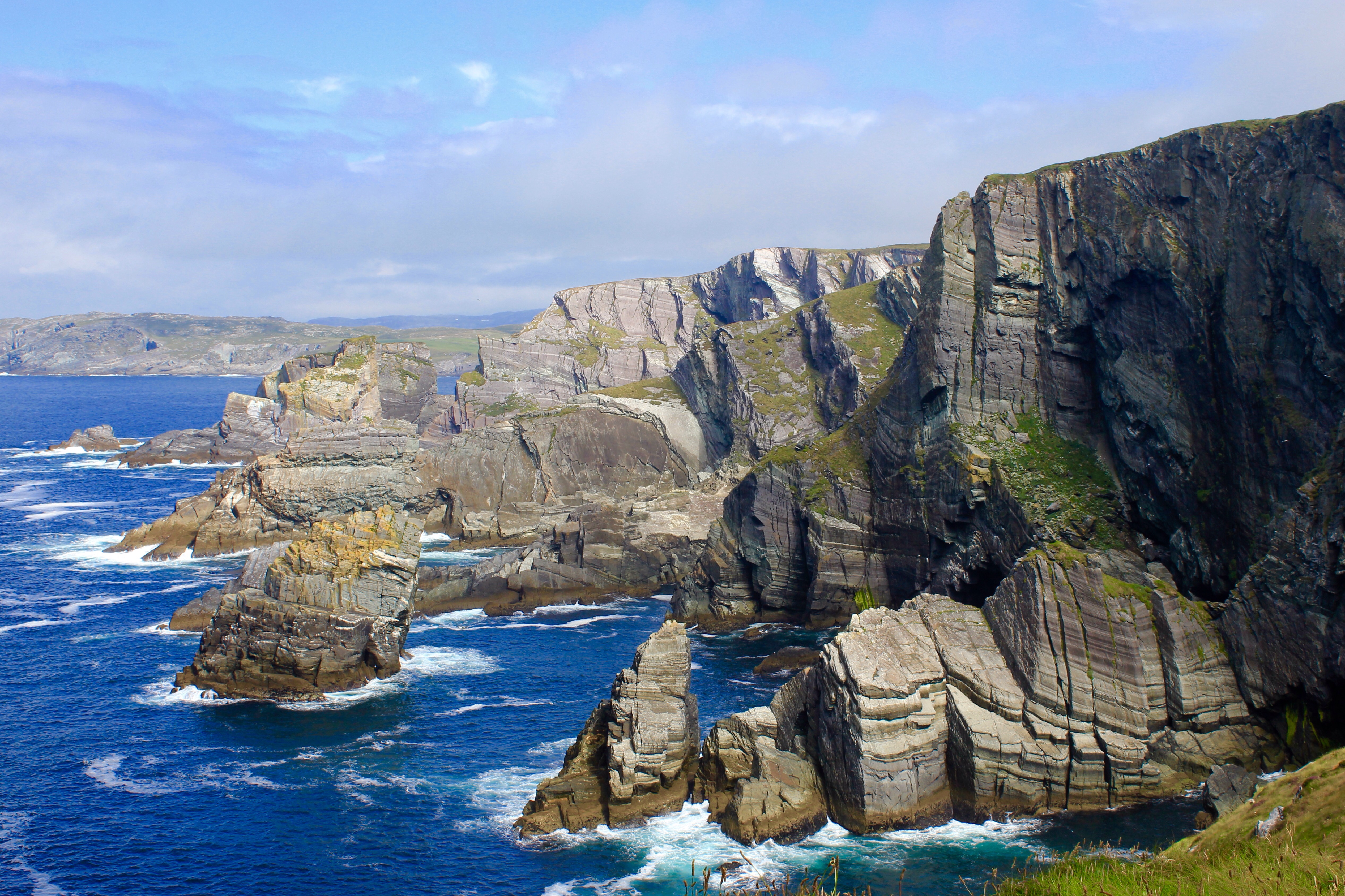 The weather remained amazingly good for the rest of the day. This was fortunate, because we had some stunning coastline views awaiting us as we continued south towards Mizen head. With the picturesque Long Island straddling the mainland and the vast, piercingly-blue Atlantic Ocean stretching out beyond, we didn’t make great progress because of all the stops we kept taking. The way was pretty up and down but we were so eager to get to the peaks to enjoy the panoramic views we at least made good progress on the climbs.