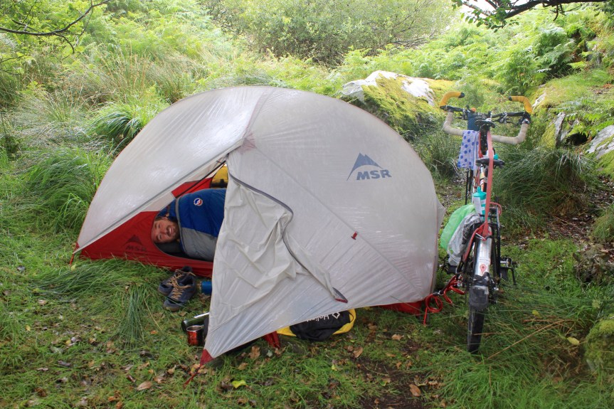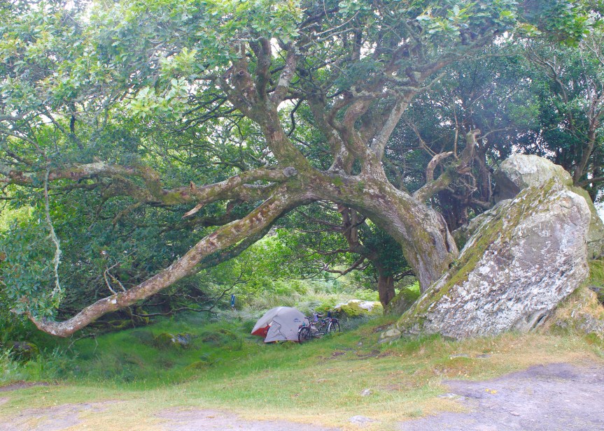 We contemplate whether the weather at the bottom will be any better but with a stunning view at Ladies View overlooking down towards Mc Gillicuddy reeks (mountain range) we decide to make a very gnarled, twisted old oak tree our home for dinner and we can decide about camping … It’s overhanging mossy branches provide a pretty good umbrella from the misty rain And it’s not until the proper rain really arrives that we start to regret not putting the tent up straight away. We are now forced to erect it in full wet weather which is never fun. In the tent Paddy delves into Irish folklore once again with more stories involving Fiin McCool such as the Salmon of Knowledge tale.