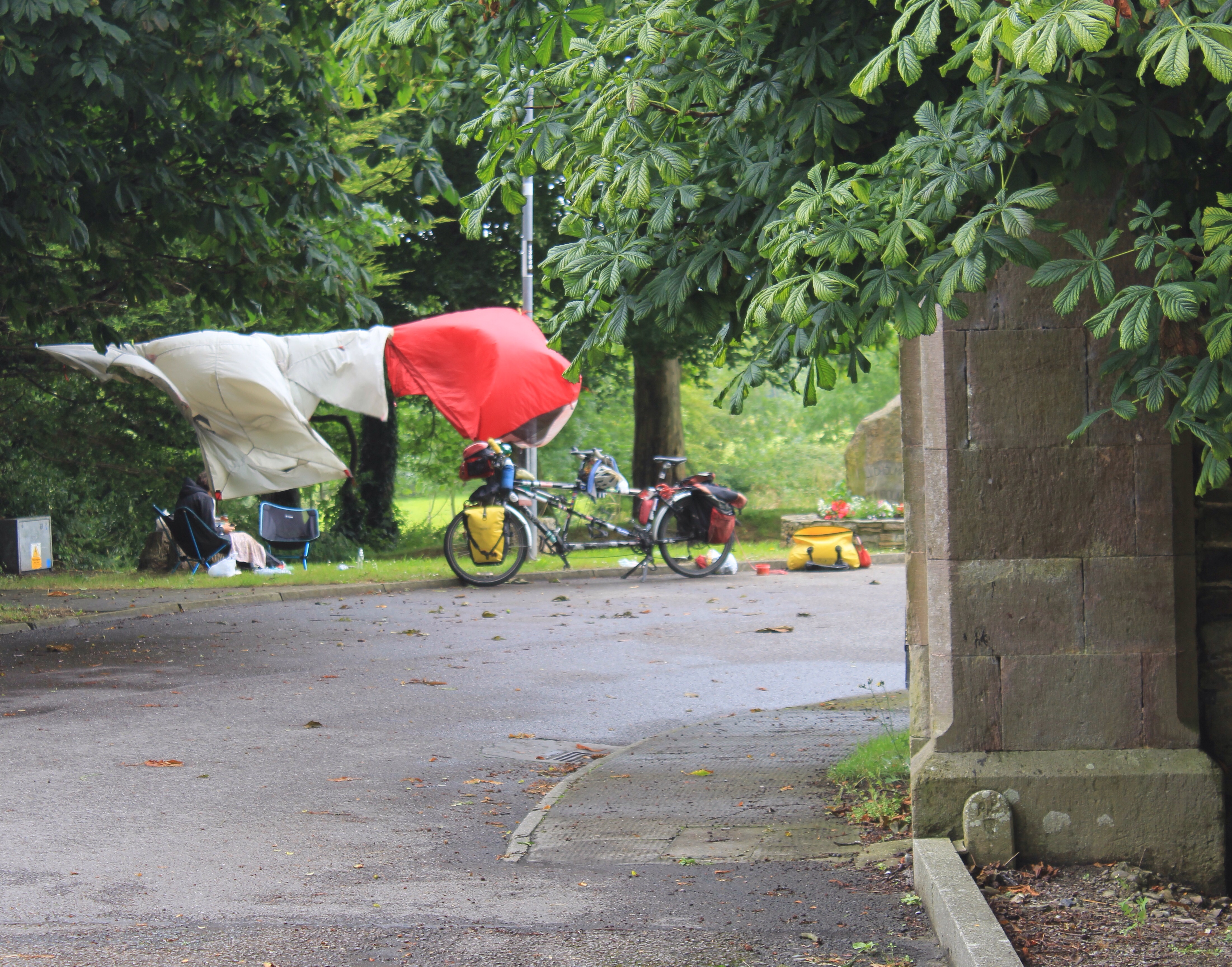 Before long we had reached Mill town – where P’s grandfather, the original Paddy Cronin, was born. We set up a mini camp on a big grassy park section of the Main Street and used the time to dry our very damp tent.