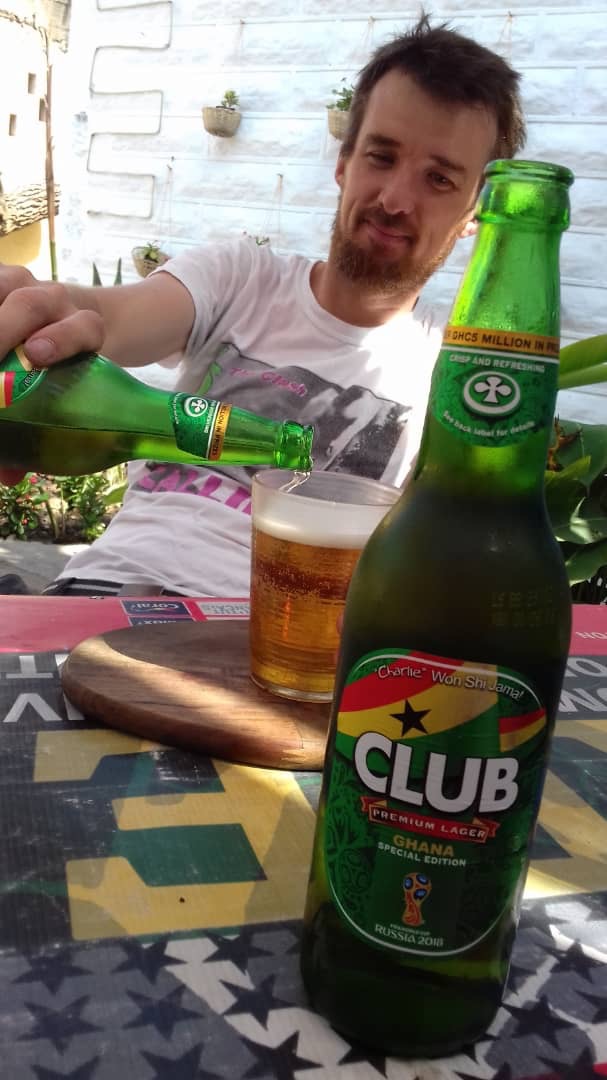 We fly from Heathrow direct to Accra with BA. No custom bike box this time – experience now tells us that the bike is pretty solid. We have simply dismantled it (to get it down to the 190cm length limit) and wrapped it in a lot of cardboard and gaffa tape before slinging it in the back of our van along with the other five bags of luggage we’re allowed. We travelled up from Cornwall late last night to give us plenty of time at the airport. We slept in the van in one of the suburb villages nearby and have had plenty of time to clear everything through the oversized baggage department. We have time for two well deserved beers.