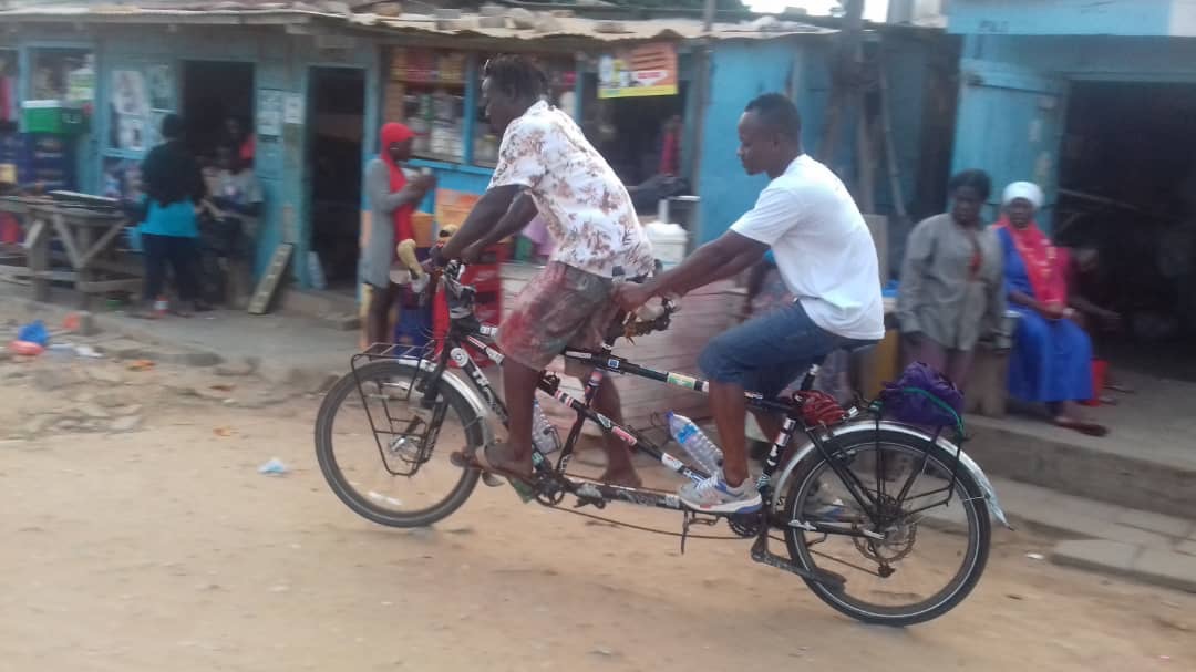 It’s fun meandering through the small streets on the tandem again. Janestown is bustling with people going about their business. We see a tiny lady steering a huge pot of porridge on a charcoal stove pounding it with what can only be described as a huge oar shaped wooden utensil. We have to try not to stare (in complete awe) at the head carrying skills of the women on the street. No rain today which was great and during the afternoon the sun even came out and Paddy got burnt in 10 minutes.