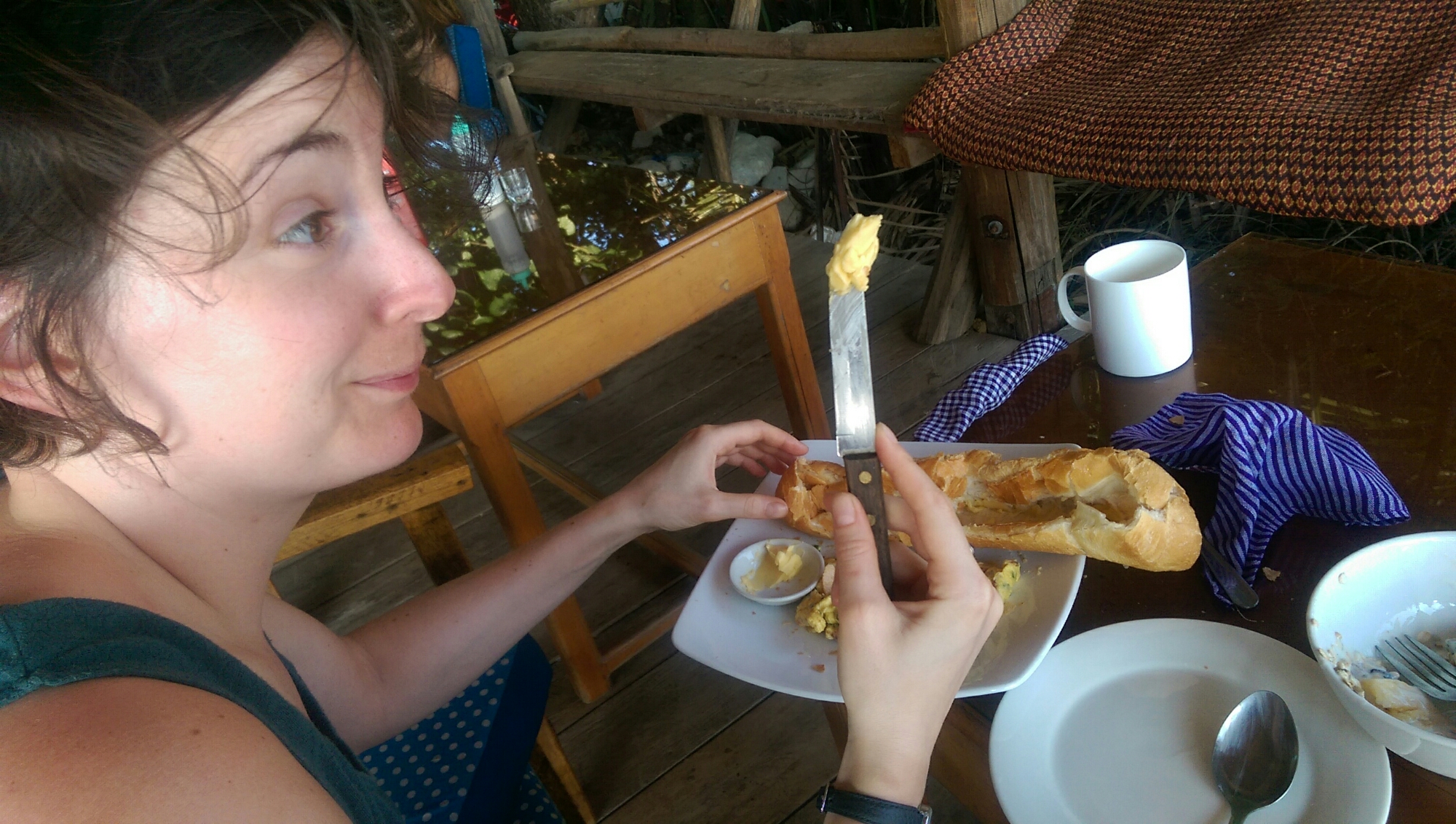 It has been great camping there by the river and after a huge breakfast with fresh rolls (and real butter!) we said our goodbyes and headed to the old market in Kampot to stock up on provisions for the next few days.