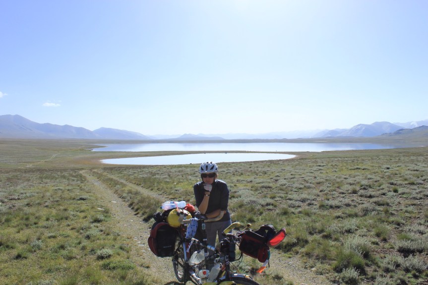 The lake, now that we’re in late July is completely dry. On the one hand, it’s fun to be able to cycle across it’s cracked surface; on the other hand, we’re running low on water as we were banking that there would be at least one stream still running down to it from the surrounding mountains.