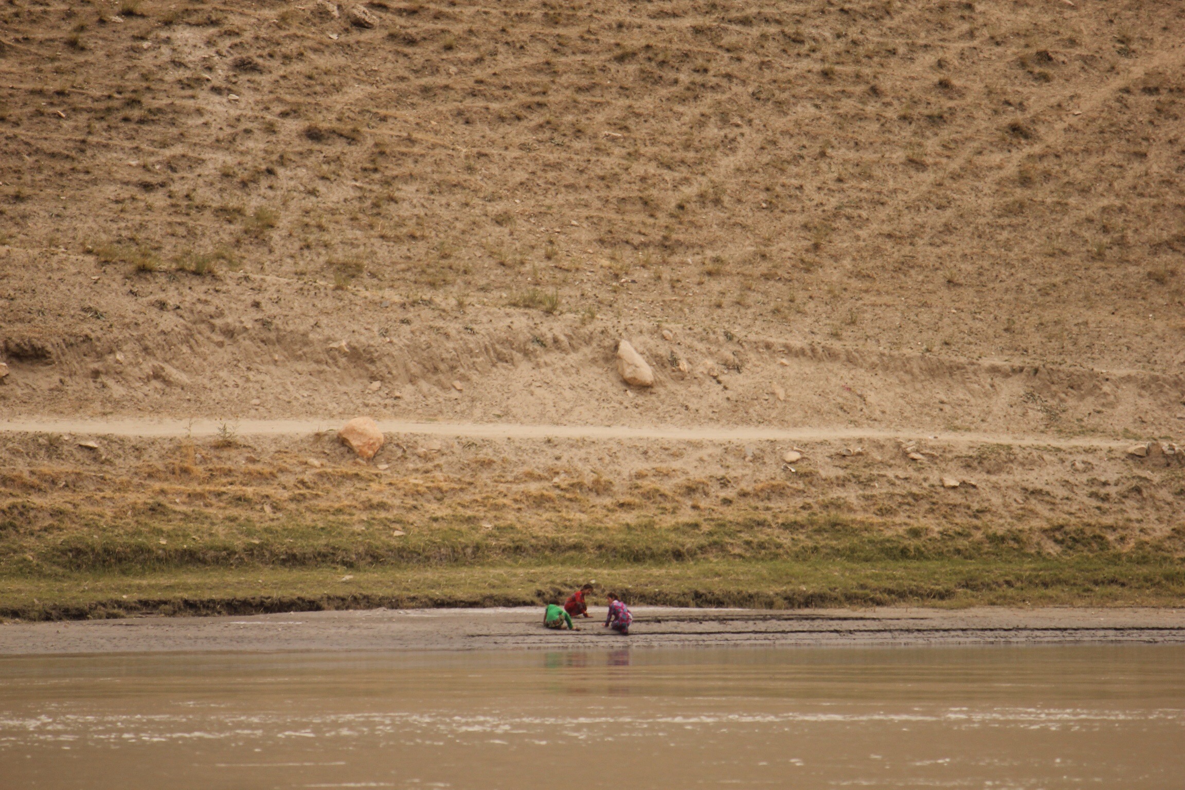 We reach the point where the Pamir river starts to flow away from the lake. We would be following this body of water which acts as the border between the two countries for the next 6 days. The bridge across the river has completely caved in so we have to pull the tandem bare foot through a series of four rivers, me pushing and keeping the bike steady while Paddy pulls and manoeuvres from the front.